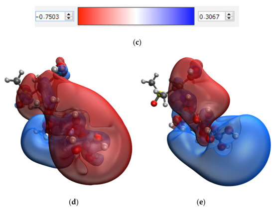 Results of quantum chemical modeling of the methionine sulfoxide molecule: model of the molecule (a), electron density distribution (b), electron density distribution gradient (c), HOMO molecular orbital (d), LUMO molecular orbital (e).