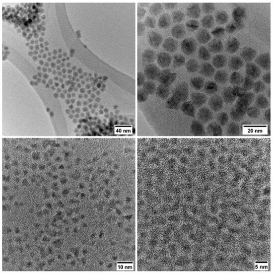Two different types of nanoparticles have been used for incorporation into CaCO3 composites, namely CuInZnS/ZnS QDs and CdSe@ZnS/ZnS QDs. Both possess core–shell structures with a ZnS shell and with CuInZnS and CdSe@ZnS cores, respectively. CdSe@ZnS means that CdSe is partially alloyed with ZnS, resulting in an improvement of QD optical properties. Both types of QDs have been synthesized using previously reported methods described in the Section 2 below. Cadmium selenide QDs are characterized by their narrow emission peak, which allows them a high color purity, which is ideal for application in QLED. Green-emitting cadmium selenide QDs have been produced according to the previous report from Lee and co-workers [31]. The authors observed superior optical properties as well as high stability for the CdSe QDs stabilized by a ZnS chemical composition gradient shell and a further coated with a second ZnS shell layer producing a giant 12.7 nm CdSe@ZnS/ZnS QDs. The role of large-band gap semiconductors such as ZnS is critical in obtaining a type-I band alignment and guaranteeing the consequent confinement of both the photo-generated electron and hole in the CdSe core, while minimizing the lattice mismatch. On the other hand, cadmium-free quaternary QDs such as copper indium zinc sulfide are of great interest due to their superior biocompatibility for the design of luminescent solar concentrators and white LED production [32,33,34]. Copper indium zinc sulfide QDs passivated with a zinc sulfide shell (CuInZnS/ZnS QDs) are produced using a protocol from Zhang and co-workers [35]. This approach is based on the isolation of a ternary copper indium sulfide core, the production of an alloyed quaternary core via ion exchange reaction in the presence of Zn2+, and finally ZnS passivation to produce a core–shell QDs. These specific CuInZnS/ZnS and CdSe@ZnS/ZnS QDs were chosen for their monodispersity and favorable optical properties as well as their broad range of applications. The TEM images of CdSe@ZnS/ZnS and CuInZnS/ZnS QDs used for encapsulation are shown in Figure 1. The morphology of the CdSe@ZnS/ZnS QDs is represented by spherical nanoparticles with an average size around 12 nm, which is characteristic of the giant core–shell QDs structure. The CuInZnS/ZnS sample was dominated by small nanoparticles with an average diameter of around 3 nm. In both systems, the nanomaterial morphology is in good agreement with the reported methods [31,35].