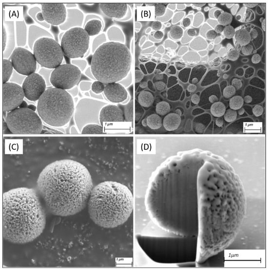 SEM images of the as-synthesized composites loaded with (A) CuInZnS/ZnS, (B) CdSe@ZnS/ZnS, and (C) doped with Eu3+, and (D) FIB analysis showing a gallium milled cross section of a Eu3+-doped CaCO3 composite.