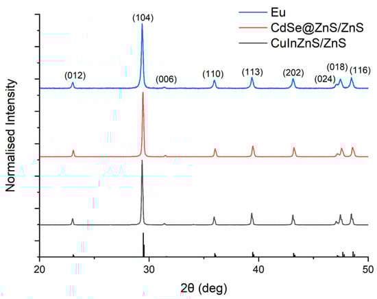 X-ray diffraction pattern of the (blue) Eu3+-doped (red), CdSe@ZnS/ZnS, and (black) CuInZnS/ZnS-loaded composites showing the expected peaks for calcite. Reference pattern below: CaCO3 calcite phase ICSD 18166.