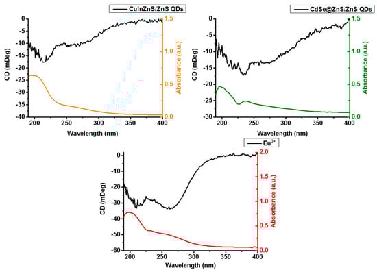 Diffuse reflectance circular dichroism (DRCD) and UV-Vis spectroscopy were carried out on all materials, as illustrated in Figure 4. A solid-state analytical technique was chosen owing to the poor solubility of CaCO3, which limits the effectiveness of analysis in solution. In DRCD, an integrating sphere coated with BaSO4 is used to allow the precise solid-state analysis of chiral compounds. BaSO4 was the chosen material for coating due to its highly reflective properties; it can reflect light evenly across a wide range of wavelengths. The UV-Vis band positions at 205 and 265 nm correspond to CaCO3 [46]. The circular dichroism data of the four samples illustrate the chiral nature of each. There is a dominating CD band that is portrayed by all three spectra in the UV region. This band appears at 220 nm, 230 nm, and 260 nm for the CuInZnS/ZnS QDs, CdSe@ZnS/ZnS QDs, and the Eu3+-loaded CaCO3 composites, respectively. All the CaCO3 composites show a strong absorption in the UV range due to the matrix, and no absorption in the visible range can be appreciated. This is likely due to the modest level of QD loading. L-cysteine is a well-known chiral amino acid, which is often used to impart chirality to nanoparticles [47]. It should be noted that the CD signal differs significantly from the CD spectrum of L-cysteine (See Supplementary Figure S9), proving that the signal is not due to free cysteine. Instead, what is observed is a lack of the Cotton effects, which is typical for chiral molecules (whereby there is a change in optical rotation in the region of maximum absorption). A potential rationalization of this phenomenon is that the amino acid is bonded to CaCO3 in such a way that its conformational freedom is highly restricted. In this scenario, the amino acid is incapable of rotating in such a way as to produce Cotton effects, i.e., the ‘switching’ of the chiral signal at the point of maximum absorbance.