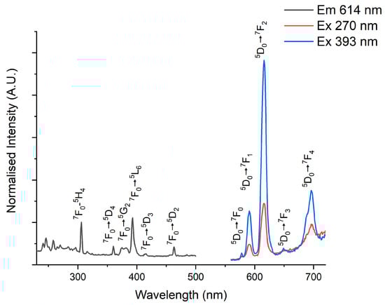 Emission and excitation photoluminescence spectra of Eu3+-doped CaCO3 composites. Emission was measured using excitation at 270 nm and 393 nm, while excitation was measured using the 614 nm peak, which corresponds to the 5D0–7F2 transition.