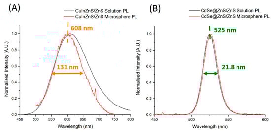Photoluminescent spectra of the QD-loaded samples compared to the original QD PL in toluene solution are shown in Figure 6. The CuInZnS/ZnS QD-loaded CaCO3 demonstrated a broad emission profile with a full width at half maximum (FWHM) of 131 nm, peaking at 608 nm, which is indicative of this type of QD. Indeed, as reported by Castro et al., copper indium sulfide quantum dots are characterized by a large Stokes shift and FWHM in the order of hundreds of nanometers [51]. Due to their detailed analysis of the origin of these optical features, the authors established that multiple intraband defects are involved in the radiative recombination via a donor–acceptor recombination mechanism. CdSe@ZnS/ZnS QD-loaded CaCO3 showed a much sharper emission peak with an FWHM of 21.8 nm centered on 525 nm, which is well-documented for the emission of II-VI QDs, which is dominated by a band-to-band recombination mechanism [31].