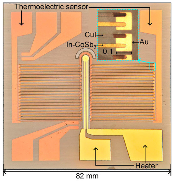 The CuI/In-CoSb3 thermoelectric sensor is developed using bare and rough soda-lime glass substrate unless otherwise indicated. A rough glass substrate produces abundant cracks and grain boundaries in the supported layers with enhanced adhesion due to material growth into nanocavities. Figure 2 shows the proposed thermoelectric sensor, which consists of 41 CuI/In-CoSb3 thermoelectric pairs of a width of 25 μm, a length of 3 mm, and a thickness of 1 μm connected electrically in series on gold electrodes. Thermoelectric pairs are arranged thermally parallel to a 100 Ω gold heater. The heater is used to produce a temperature gradient across the thermoelectric pairs.