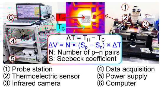 The thermoelectric response is measured in a probe station equipped with an infrared camera (CompactPRO, Seek Thermal Inc., Santa Barbara, CA, USA; sensitivity: 1 K), a data acquisition system, and a power supply, as displayed in Figure 5. The infrared camera is calibrated and shows a measurement deviation of 0.2 ± 1.6 K compared to a fine wire thermocouple, which allows accurate monitoring of the point temperature [27]. The temperatures of the cold and hot regions are recorded in video format at 15 frames per second, and the temperature data are obtained by image post-processing in MATLAB 2023b. The temperature difference (ΔT = TH − TC) is obtained from two successive Joule heating tests with the incorporated heater. Point temperature is monitored on the interconnection electrodes at the center (TH) and border (TC) of the thermoelectric sensor, as indicated in a thermal image in Figure 5. The voltage output is recorded at 10 Hz. The thermal gradient is produced with the incorporated heater while applying various voltages.