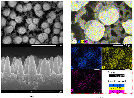 Characterization of the RIE-treated glass reveals the formation of non-volatile segregates. The residual hard layer consists of randomly distributed cone-shaped nanostructures on a porous ground layer with abundant cracks, as indicated in Figure 6a. The residual structures contain mainly NaF, which is in agreement with a previous study [35]. Thicker residual layers are obtained with a thicker photoresist seed layer, suggesting that the hard photoresist enhances the masking effect and surface roughening for the equivalent time for the RIE treatment. The resulting glass with nanocavities is important for the mechanical interlocking of supported layers featuring poor adhesion.