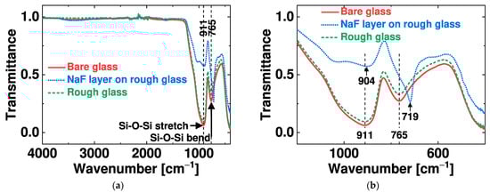 The organic residuals on the rough glass substrate were analyzed by Fourier transform infrared (FTIR) spectrometry. Figure 8a presents the transmission spectra of three glass specimens: bare glass (control), glass with a residual layer, and rough glass. The residual layer that forms during the RIE treatment is composed of NaF and carbon, as shown in Figure 6b. The presence of F in the silicate networks shifts the stretching and bending vibrational modes of Si-O-Si towards lower wavenumbers, as shown in Figure 8b [28]. A shift to a lower wavenumber suggests degradation of the silicate structure, resulting in reduced energy of the Si–O bonds attributable to the residual layer weakly bonded onto the glass surface [29]. A cleaned rough glass sample shows a transmission spectrum similar to that of bare glass, which suggests a lack of hard organic residuals or fluorinated carbon [30].