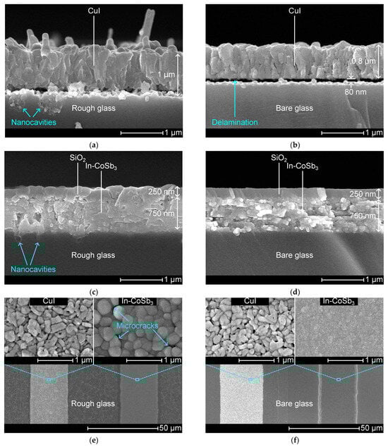Scanning electron microscope images of thermoelectric layers. Cross-sectional view of CuI on (a) rough and (b) bare glass. Cross-sectional view of In-CoSb3 on (c) rough and (d) bare glass. Surface morphology of CuI (left) and In-CoSb3 (right) on (e) rough and (f) bare glass.