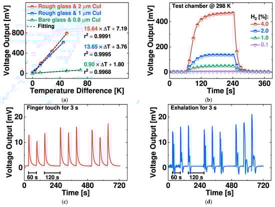 The thermoelectric sensor is employed in several low-temperature sensing applications. Figure 11b depicts the sensing response to hydrogen gas from 0.1 to 4%, in which Pt/TiO2 catalytic ink is dispensed onto the heater region. The sensing test is conducted under ambient conditions with hydrogen in artificial air [27]. The sensor shows a response of 48 mV for 1% H2 under such a condition. Also, the time evolution of the voltage output is plotted for finger touch and for breath at the device center in Figure 11c,d, respectively. The thermoelectric sensor yields a result of 10–15 mV for the finger touch and 15–20 mV for breath, with both actions sustained for 3 s.
