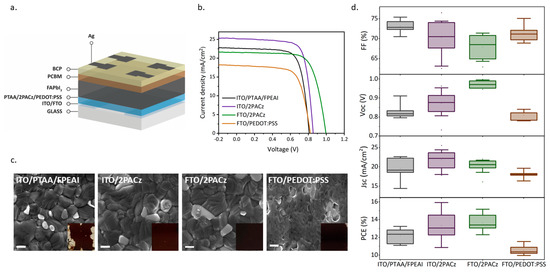 These results are in line with a previous report showing how the preparation in air can increase the stability of FAPI thanks to the formation of bonds with the oxygen in the air, which are able to block the formation of the δ-phase [41]. We investigated the morphology of the samples by acquiring scanning electron microscopy (SEM) images and found that they were slightly different for the two formulations (Figure 2). While both samples had a staircase-like structure, the grain size was visibly larger in the case of DMF:NMP. On the other hand, the morphology was more homogeneous in the DMSO sample as the grain sizes were smaller and close to an average value of 1.2 µm, whereas the grain size of the DMF:NMP sample ranged between 0.5 µm and 2.5 µm. It is worth mentioning that, apart from the different solvent systems, the two samples also differed in annealing temperature, where the DMF:NMP sample was annealed at 165 °C while the DMSO sample was annealed at 150 °C, which could explain the smaller grain size, as it has been shown that higher annealing temperatures promote the formation of larger grains [42]. Nevertheless, the temperature was optimized for the two formulations to achieve complete conversion of the perovskite precursors to perovskite. As a result of the characterizations, we evaluated the DMF:NMP and DMSO formulations as suitable for air deposition and decided to move onto the device fabrication. As a first step, the DMF:NMP formulation was selected for the initial optimization, since the larger grain size combined with good crystallinity holds promise for PSCs with good performances. Devices were fabricated in inverted p-i-n configuration, but we found that there were serious wettability issues with the FAPI ink on the HTL when deposited in ambient air. This is a known issue for the inverted p-i-n architecture [43], but the problem was exacerbated in ambient air, and particularly in high humidity environments (RH > 50%). To address this issue, different HTLs were tested in the device’s structure to determine the best one in terms of both wettability and performance. We also fabricated devices on both ITO and FTO as transparent conductive oxides (TCO), since while ITO is far more popular as a bottom electrode, FTO has a higher surface roughness, which could be beneficial for the adhesion of the perovskite solution [44]. The criteria used to select the HTLs for testing were the compatibility of the material with the perovskite solution, as hygroscopic materials combine better with the polar perovskite solution, and the promise of high efficiency according to the results reported in the literature. The selected HTLs were poly(bis{4-phenyl}{2,4,6trimethylphenyl}amine (PTAA), 2PACz and poly(3,4-ethylenedioxythiophene) polystyrene sulfonate (PEDOT:PSS), and the device structure and current–voltage (I–V) curves are shown in Figure 3a,b, respectively. PTAA and 2PACz were chosen for reaching high efficiency, while PEDOT:PSS was chosen primarily to increase the coverage since it is more hydrophilic, allowing for good spreading of the perovskite solution on the substrate. Among the selected HTLs, PTAA was the worst in terms of wettability and the deposition of a continuous FAPI perovskite was not feasible. This is not surprising given the hydrophobic nature of the PTAA layer, which can provide protection against moisture [45] but also reduces the adhesion of the polar perovskite solution. For this reason, a thin interlayer of 4-fluoro-phenethylammonium iodide (FPEAI) was deposited atop the PTAA HTL to improve the wettability and device performances [46]. SEM images of the perovskite samples deposited on the different HTLs are shown in Figure 3c. We found that even with the interlayer of FPEAI, the coverage on PTAA was really poor and several pinholes were visible in the SEM image. The incomplete coverage severely affected both the reproducibility of the deposition and the device performance (Figure 3c). In addition, the FAPI grains were slightly different and smaller compared to those of the FAPI deposited on 2PACz, which ultimately reduced the current density of the device [47]. The films on 2PACz and PEDOT:PSS were significantly better, although some pinholes were present in all cases. The best morphology was obtained with 2PACz as HTL, which favors the formation of large and compact grains. PEDOT:PSS, on the other hand, although it has a very good wettability due to the hygroscopic nature of the material [48], had the worst morphology, with very small and disordered grains. Accordingly, the performances were the worst, with very low Voc and Jsc values. Although it has been reported in several works that PEDOT:PSS as HTL in PSCs causes losses in the Voc value because the work function does not adequately match the work function of the perovskite [49,50], it is clear that the morphology of the perovskite contributes significantly to the device performance. In the final analysis, the self-assembly monolayer of 2PACz was found to be the best HTL, both in terms of morphology and performance, with maximum comparable power conversion efficiencies of 15.9% on ITO and 15.2% on FTO (Table 1). Specifically, while the morphologies were very similar, the devices with FTO/2PACz achieved the highest value of Voc, while the devices with ITO/2PACz had the highest value of Jsc (Figure 3b), which is consistent with other reports that ITO generally promotes a higher Jsc compared to FTO [51] in inverted perovskite solar cells. This comparison confirms the superiority of the SAMs as HTL, which not only allowed us to obtain a good coverage in humid ambient air with a good perovskite morphology, but, as was already reported, they are able to provide both fast extraction and passivation at the interface, significantly limiting the non-radiative losses resulting in high Voc values [52].