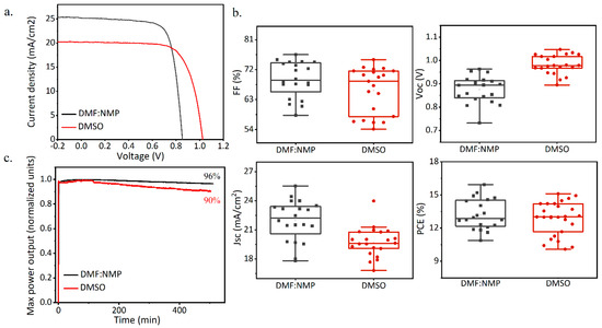 Once 2PACz was found to be the optimal HTL to achieve high efficiency and good wettability of the perovskite inks, devices were fabricated using the DMSO formulations and the performances were compared with the DMF:NMP devices. The device structure was ITO/2PACz/FAPI/PCBM/BCP and the performances are shown in Figure 4. ITO was chosen as the transparent conductive oxide instead of FTO as it gave the best overall efficiency. As can be clearly seen from the I–V curves and the photovoltaic parameters in Figure 4a,b, the DMSO formulation presented an enhanced average Voc value compared to the DMF:NMP formulation, suggesting the minimization of the recombination of the charge carriers and a perovskite material with fewer defects [53]. However, we also observed a decrease in the Jsc values, consistently with the lower dimension of the perovskite grains. As a result, the PCE values were slightly lower for the DMSO formulation, although still comparable to the DMF:NMP formulation, with a maximum value of 15.1% of efficiency. Finally, the stability of the photovoltaic devices was assessed through maximum power point tracking measurements under the continuous illumination of 100 (mW/cm2) in the glove box (Figure 4c). The device based on the DMF:NMP formulation showed a better stability, maintaining almost the performance, up to 96% of the efficiency after 20 h of illumination, while the device based on the DMSO formulation suffered a more significant power loss, retaining 90% of the initial efficiency after the same time. These results suggest the superiority of the DMF:NMP formulation for the air deposition of FAPI, both in terms of efficiency and stability. Nevertheless, the DMSO formulation was also proven to be suitable for ambient air deposition, achieving comparable efficiency and particularly high Voc values. Importantly, DMSO has a lower toxicity when compared to DMF [26], making it even more compatible for the possible upscaling of the PSC technology.