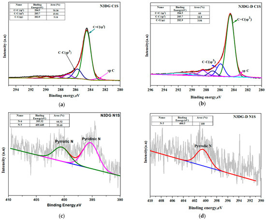 Shirley-type baseline was used for performing XPS peak deconvolution along with Lorentzian (20%)/Gaussian functions. Figure 4a,b give the carbon C1s deconvolution spectra of N3DG and N3DG-D. N3DG exhibits higher sp2 (C–C) linkage and low sp3 (C–C) linkage at binding energies of 284.5 eV and 285.7 eV compared to N3DG-D [29].