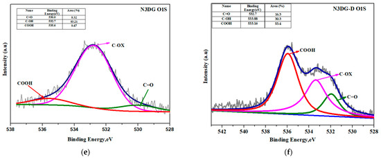 Figure 4e,f presents the high-resolution spectra of the O1s. The deconvolution of N3DG-D O1s indicated the presence of the predominant oxygen group as the carboxyl group at the binding energy of 536 eV, followed by the hydroxyl group at 533.8 eV and the carbonyl group at 532.7 eV. In contrast, the less defective N3DG showed hydroxyl groups in a greater percentage (83.21%), followed by less than 10% of carboxyl and carbonyl groups. The presence of an abundant hydroxyl group in N3DG can enhance wettability with aqueous electrolyte solutions [30,31,32], which is favorable for the applications proposed in this study.