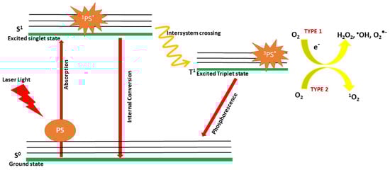The mechanism of PDT is a combination of photophysics and photochemistry []. The basic working mechanism is explained by the Jablonski diagram, a three-level energy diagram depicting light absorption, fluorescence emission, and phosphorescence emission []. On irradiation with light of a specific wavelength, a pair of electrons with an opposite spin in the stable ground state (S0) of a PS can be excited to the unstable singlet level (S1) by absorbing photons. In certain cases, the electrons at the S1 level will dissipate the excess energy via internal conversion (IC) and vibrational relaxation, thus leading to fluorescence emission. Alternatively, the PS with electrons in the S1 level can undergo intersystem crossing (ISC) by encountering a change in spin multiplicity to the excited triplet state (T1). At this T1 state, the PS can undertake two pathways: the radiative type decay (Type II) or the non-radiative type decay (Type I). Type II is the simplest and most important functioning mechanism in PDT, where the direct transfer of energy from the PS to the molecular oxygen existing in its basic triplet energy level (3O2) occurs, hence leading to the generation of singlet oxygen (1O2). In Type I, a transfer of hydrogen or electron occurs between the PS and innate substrates in the tissue microenvironment, leading to the formation of reactive oxygen species (ROS), followed by the production of H2O2 and superoxide anion radicals (O2•−), which are both cytotoxic (Figure 1) [,,]. However, in the case of organic PS, the electronic transition to T1 is forbidden, which indeed interrupts the ISC. Recent studies focus on designing photosensitizers with advancements in raising the efficiency of the S1-T1 transition or by reducing the band gap between the energy levels []. One such alternative is photosensitizers based on aggregation-induced emission (AIE), which have marked proficiency in cancer therapy by generating surplus ROS through Type I non-radiative decay [,]. In addition to AIE luminogens, heavy metal-based PSs are also in use but restricted by their dark toxicity.