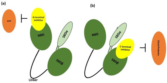 A schematic diagram of HSP70 and the inhibition of HSP70 via the N-terminal and C-terminal inhibitors. The HSP70 has an N-terminal nucleotide-binding domain (NBD) responsible for ATPase activity and a C-terminal substrate-binding domain (SBD) required for peptide binding. A linker connects two domains. The N-terminal NBD provides ATP/ADP pockets for ATP binding. The SBD is further divided into two subdomains, SBDα and SBDβ, which function as the lid and core, respectively, during substrate binding. (a) The N-terminal inhibitor binds to NBD by competing with ATP, thus hindering its interaction with the NBD of HSP70. (b) The C-terminal inhibitor binds to SBDβ by restricting the interaction of HSP70 with its client proteins.