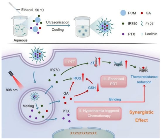Using an ultrasonication process, Wang et al. combined the chemo drug paclitaxel (PTX), IR-780, and GA to prepare PTX-IR780-GA for PTT/PDT/chemotherapy of breast cancer (Figure 5) []. Using 1-hexadecanol and oleic acid, they prepared a thermoresponsive phase-change material with a melting point of 46 °C, that can be used to control the drug release triggered by hyperthermia. When exposed to NIR light, this material can be transformed from solid to liquid and release PTX and IR-780, which can produce ROS for PDT and induce PTT from mild hyperthermia. The released GA can bind to the ATP-binding pocket of HSP90 and upregulate the levels of ROS by consuming its intracellular scavenger glutathione (GSH). The ability of GA to elevate ROS and downregulate the expression of HSP90 was verified. The tumor-bearing mice administered with PTX-IR780-GA showed a 50% reduction in tumor size when compared with PTX-IR780, confirming the potential of GA to boost the efficiency of mild PTT/PDT.