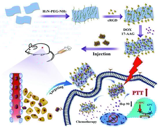 Zhu et al. developed a boron (B)-based multifunctional nanoplatform by incorporating the chemotherapeutic drug doxorubicin (DOX) and the photothermal agent boron nanosheet. The B nanosheet was surface-modified with NH2-PEG-NH2 and cRGD to target the overexpressed αvβ3 on the tumor cell surface for loading DOX and 17-AAG by physical adsorption []. The DOX-17AAG@B-PEG-cRGD was used successfully for targeted delivery of DOX and 17-AAG, where DOX-mediated chemotherapy and HSP90 inhibition-mediated enhanced low-temperature PTT from 17-AAG provide excellent anti-cancer efficacy (Figure 6). An in vivo murine cancer mode indicates the injection of DOX-17AAG@B-PEG-cRGD plus NIR laser irradiation can reduce the cell viability depending on the concentration of 17-AAG. This treatment provides a significant reduction in cell number compared to the injection of free 17-AAG or DOX-17AAG@B-PEG-cRGD without laser irradiation.