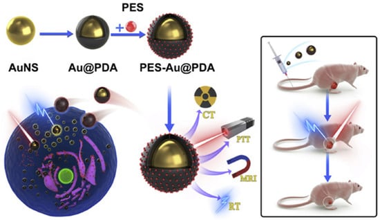 A different nanoplatform based on HSP70 inhibition was developed by Zhu et al. by coating a gold nanosphere (AuNS) (a radiosensitizer) with polydopamine (PDA) (a PTA) and PES to enhance the multimodal treatment efficacy of radiotherapy (RT) and PTT []. This nanoagent can also be used for monitoring the progression of cancer therapy using computer tomography (CT) and magnetic resonance imaging (MRI) (Figure 8). In this design, PES was employed to inhibit HSPA5, a member of the HSP70 family, by amplifying the pro-apoptotic unfolded protein response (UPR). By incorporating PES, the nanoparticle triggered the UPR cascades and improved the therapeutic efficacy of PTT and RT against the human glioblastoma cancer cell line SW1783 in vitro and in vivo.
