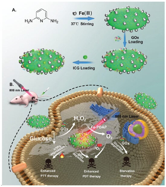 Another study by Wu et al. reports a similar strategy to reverse tumor cell thermoresistance by exploiting the catalytic behavior of GOx in HSP regulation. They used PEGylated CaCO3 nanoparticles to encapsulate antimonene quantum dots (AQDs) as a PTA and GOx to engineer a pH-sensitive nanocatalyst G/A@CaCO3-PEG system, which can also be used for photoacoustic imaging []. With laser light absorption within the NIR window, GOx can restrict the production of ATP along with the deceleration of the expression of HSP to augment hyperthermia-based mild PTT. Image-guided photonic hyperthermia was demonstrated in vivo using tumor-bearing mice. In a different work by Xia et al., the group used two thermosensitive liposomes: GOx-loaded liposome (GOx@Lipo) for ST, and organic NIR dye 1,1′-dioctadecyl-3,3,3′,3′-tetramethylindotricarbo cyanine iodide (DiR)-loaded liposomes (DiR@Lipo) for PTT and PDT []. After co-administration of GOx@Lipo and DiR@Lipo to the tail veins of mice bearing 4T1 tumors plus 808 nm laser light irradiation, the combination ST/PTT/PDT shows excellent tumor inhibition via downregulation of heat-induced production of HSP. Interestingly, they also demonstrated that ST could inhibit tumor metastasis through an immunogenic effect. Another multimodal image-guided nanosystem aiming at the combined effects of ST/PTT/PDT was developed by Cao et al. using Fe-doped polydiaminopyridine (Fe-PDAP), an excellent biocompatible organic polymer nanoagent showing catalase-like activity, to load ICG and GOx []. In Fe-PDAP/GOx/ICG, the GOx catalyzes the reaction to exhaust glucose for ST, as well as relieving the heat resistance of cancer cells by improving the efficiency of PTT from HSP reduction. Most importantly, Fe-PDAP can replenish the oxygen supply by decomposing intrinsic and GOx-produced H2O2 to alleviate hypoxia and boost O2-dependent PDT (Figure 9). The nanoparticle can substantially improve the outcomes of mild-temperature PTT and PDT by ablating tumors and showing minimal systemic toxicity and multimodal imaging capability.