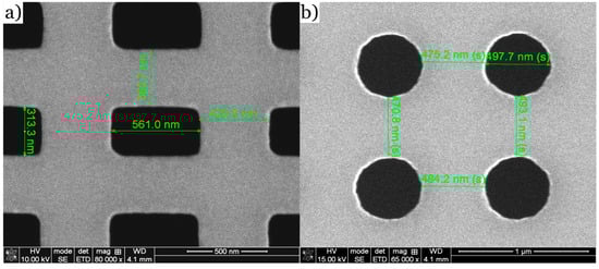 SEM images of the two geometries of the regular hole pattern. (a) Regular hole pattern of 560 nm × 310 nm rectangles with a lattice constant of roughly 1 µm in the x-direction and 650 nm in the y-direction. (b) Regular hole pattern of 500 nm holes with a lattice constant of about 1 µm in the x- and y-directions.