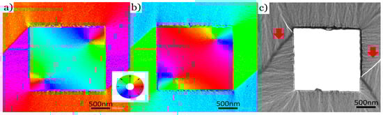 To first confirm the magnetic origin of the differential phase contrast signal, a large isolated square defect of 2 µm × 2 µm was observed in the TEM. Figure 2a shows the DPC image of the sample at a remanence 0° tilt relative to the incident beam after being saturated by the objective lens at a sample tilt of 25°. The square was imaged again, as shown in Figure 2b, after being saturated in the opposite direction in the same manner by tilting the sample by −25°. Ignoring the signal in the hole that can be attributed to a detector offset and stray field contributions from the hole edges, domains of different color can be clearly identified around the edges of the defect. In particular, domain walls seem to nucleate from the corners, which is expected for defects of this scale. Looking at the color wheel, the domain colors are flipped by 180° after re-magnetizing the sample in the opposite direction, which is a clear indication for the magnetic origin of the signal. Furthermore, a Lorentz microscopy image of a similar defect shows an almost identical domain wall pattern around the edges, indicated by the red arrows in Figure 2c. Therefore, DPC magnetic imaging is indeed a useful tool to investigate nano-patterned magnetic thin-film membranes.