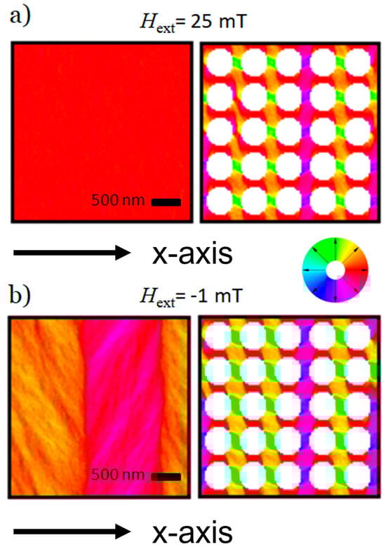 (a) Comparison of an unpatterned 60 nm thick Co70Fe30 membrane (left) and a Co70Fe30 membrane with a regular pattern of circular holes (right) at an external field of 25 mT parallel to the x-axis. Measurements for the circular hole pattern were taken from experimental SEM results. (b) A comparison of the same films at an external field of −1 mT parallel to the x-axis. Scale bars are the same for left- and right-hand side images. The colors in (a) and (b) are coded directions of magnetization and are defined according to the color wheel.