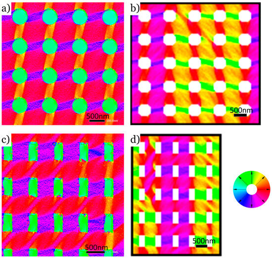 (a) Measured DPC image for the circular hole pattern from Figure 1 at remanence and at 0° tilt with regard to the incident electron beam. Before the measurement, the magnetization was saturated using the field of the objective lens at a tilt angle of 25°. (b) Simulated magnetic domain configuration at remanence for the circular hole pattern shown in Figure 1b. To properly represent the experiment, measurements from the SEM were used for the calculation. (c) Measured DPC image for the rectangular hole pattern from Figure 1 using the same imaging conditions as (a). (d) Simulated magnetic domain configuration at remanence for the rectangular hole pattern shown in Figure 1a. SEM size measurements were used for the calculation. The colors in (a–d) are coded directions of magnetization and are defined according to the color wheel.