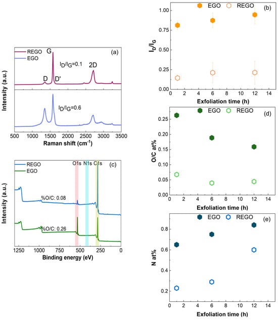 Figure 1a presents the Raman spectra for EGO and REGO obtained after 1 h of exfoliation. The typical G, D and 2D bands of graphene-type materials are visible between 800–3000 cm−1. The G band is associated with the graphitic structure through an in-plane C sp2 vibration, and the D band is related to the disorder concentration and represents the out-of-plane variation of sp2 carbon rings active near edges and defects. The 2D band is the second order of the D band and is related to the number of graphene layers [64,65]. The Raman spectrum of the graphite foil was recorded and used as a reference (Figure S1a). As illustrated in Figure 1a, the intensity of the D band is always lower than that of the G band, confirming the high quality of the graphene-type materials obtained by electrochemical exfoliation in (NH4)2SO4, even before a thermal reduction. The ID/IG ratio, which is a measure of the density of defects [65], increases from 0.78 to 0.95 (0.14 to 0.21) for the EGO (REGO) materials as the exfoliation time increases from 1 h to 12 h, Figure 1b. As expected, the ID/IG ratio decreased significantly after the thermal treatment [38,39,44]. According to the deconvolution of the 2D band [64,66,67,68] and to the IG/I2D integrated intensity ratio [69,70,71], the exfoliation of graphite foil in 0.1 M (NH4)2SO4 produces mostly bilayer-reduced graphene oxide flakes, Figure S1 and Table S1.