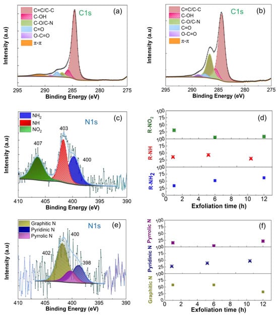 Figure 1c presents the survey XPS spectra for EGO and REGO obtained after 1 h of exfoliation. The characteristic C 1s and O 1s lines are clearly visible. The N 1s peak is hardly seen in the survey spectra, but the presence of N-species was confirmed through the core level spectra (see Figure 2 below). Interestingly, the O/C at% ratio of EGO decreases from 0.26 to 0.16 as the exfoliation time increases from 1 h to 12 h, Figure 1d. This decrease is complemented by an increase of the amount of nitrogen species from 0.65% (1 h) to 0.85% (12 h), Figure 1e. An increase in the exfoliation time allows for a sustained formation of oxidizing species at the vicinity of the graphite electrode and nucleophilic attack of the graphite foil by these species [44,72]. In this work, the exfoliation time is at least one hour. Thus, the freshly formed EGO flakes dispersed in the electrolyte most likely endure a nucleophilic attack by the OH anions, HO· and O· radicals. On the one hand, the oxygenated functional groups are key intermediates in the functionalization of graphene materials by N-moieties [73,74]. On the other hand, a longer exposure of the EGO flakes to the electrolyte allows for more oxygenated functional groups to react with (NH4)+/NO2 ions (see below). The thermal reduction decreases the oxygenated and nitrogen species by a factor of 3, which is unsurprising since it was carried out at 900 ℃ [75]. A similar trend of N% vs. exfoliation time was observed before and after thermal reduction, which suggests that the N content could be further increased by extending the exfoliation time in (NH4)2SO4.