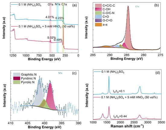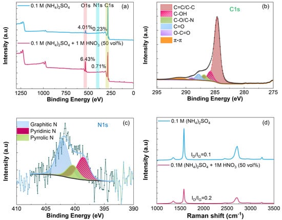 Figure 4. (a) XPS survey, (b) C1s, (c) N1s and (d) Raman spectra of REGO obtained using 0.1 M (NH4)2SO4 + 1 M HNO3 (50 vol%) mixed electrolyte, followed by thermal reduction at 900 °C. The XPS survey and Raman spectra of REGO obtained in 0.1 M (NH4)2SO4 were included in Figure (a,d) for comparison.