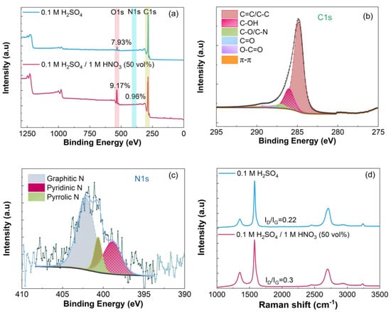Figure 5. (a) XPS survey, (b) C1s, (c) N1s and (d) Raman spectra of REGO obtained using 0.1 M H2SO4 + 1 M HNO3 (50 vol%) mixed electrolyte, followed by thermal reduction at 900 °C. The XPS survey and Raman spectra of REGO obtained in 0.1 M H2SO4 were included in Figure (a,d) for comparison.