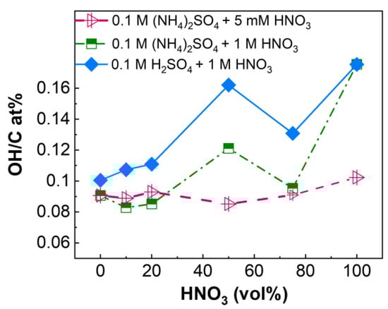 Figure 6. Variation of OH/C at% as a function of the HNO3 vol% in the electrolyte.