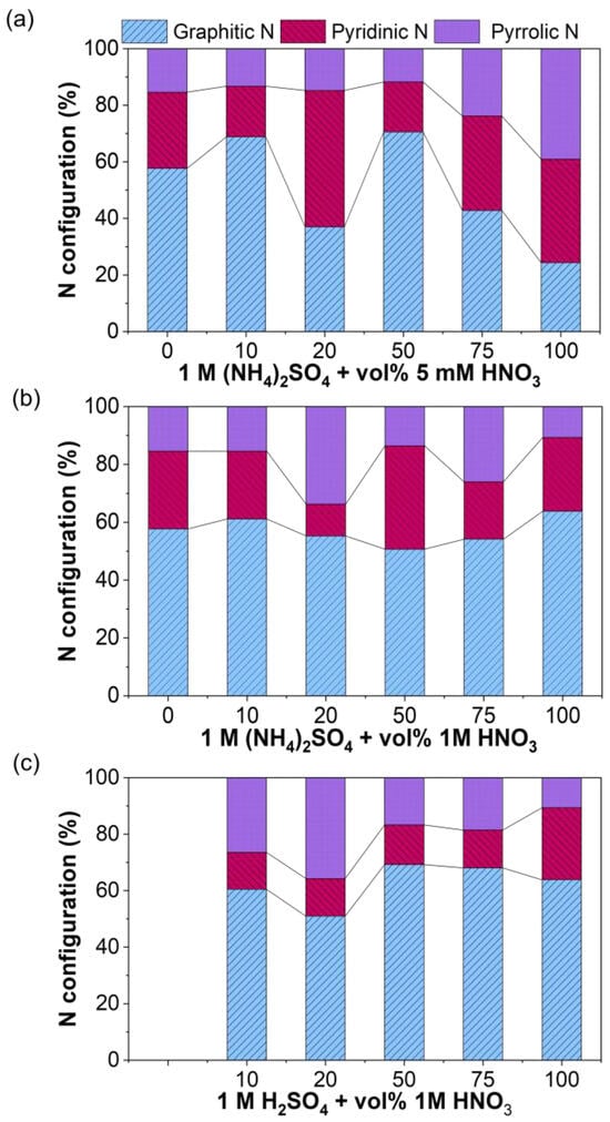 Figure 7. Variation of N at% components in REGO synthesized by electrochemical exfoliation in (a) 0.1 M (NH4)2SO4 + 5 mM HNO3, (b) 0.1 M (NH4)2SO4 + 1 M HNO3, (c) 0.1 M H2SO4 + 1 M HNO3. All samples were thermally reduced at 900 °C in Ar atmosphere.