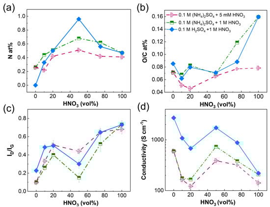 Figure 8. Variation of (a) N at%, (b) O/C at%, (c) ID/IG and (d) electrical conductivity of the REGO samples as a function of the HNO3 vol% in the electrolyte.
