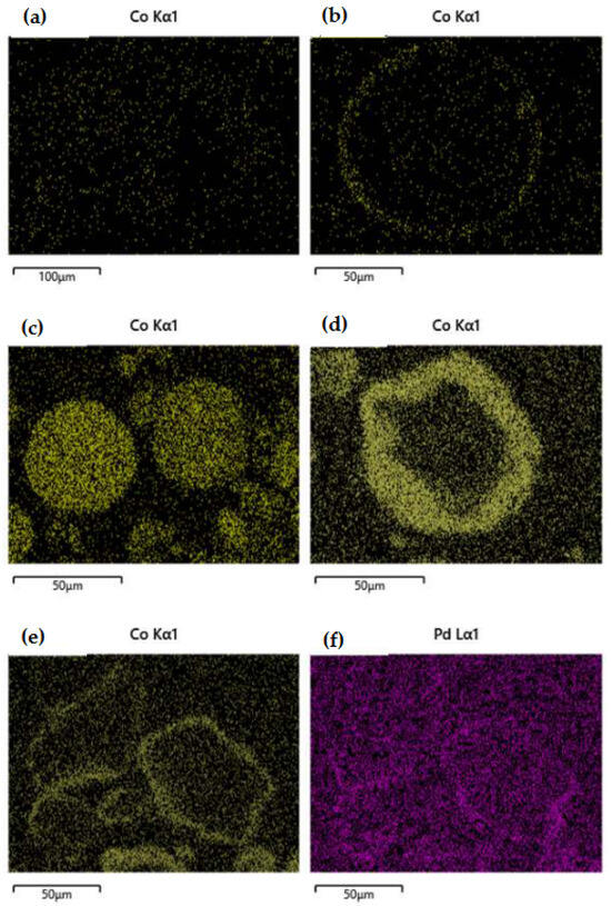The SEM images of selected samples are presented in Figure 2a–f. The differences between the two synthesis methods were investigated focusing on the preferential deposition of Co (yellow spots) and Pd (purple spots) over the alumina carrier. The image of the 1Co/Al sample, prepared with the wet impregnation method (Figure 2a), shows that Co is dispersed all over the alumina particle, while on the other side, the spray impregnation method (Figure 2b) achieves the deposition of Co on the outer surface of the alumina particle, creating the desired core–shell nanostructure. In the case of a higher Co content (5 wt.%), the deposition of the metal oxide on the outer surface of the alumina particle is even more obvious when applying the SI method than when applying the WI method (Figure 2c,d), where the cobalt is once again dispersed all over the alumina particle. Similarly, the incorporation of Pd via spray impregnation resulted in Pd deposition on the outer surface of Co on the alumina carrier, since the metal impregnation was performed successively (Figure 2e,f).