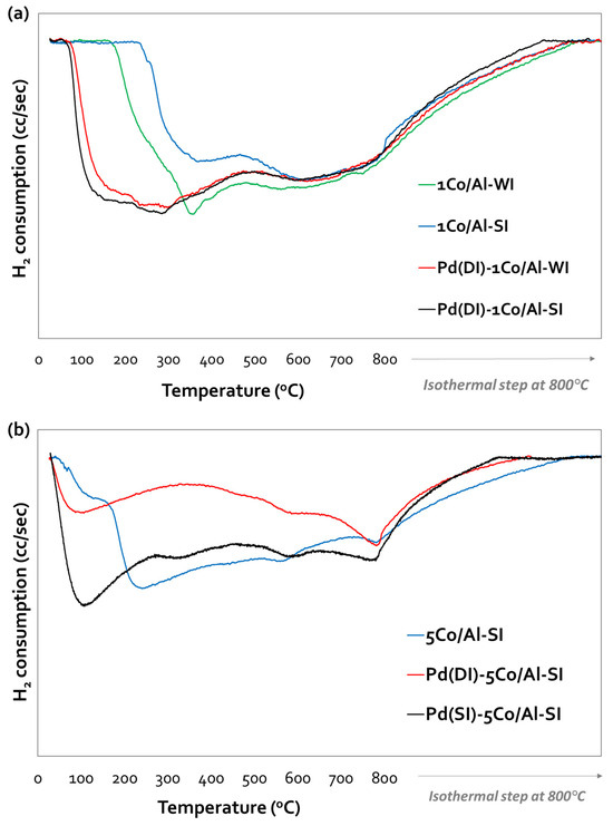 The reducibility of all samples was investigated with TPR-H2, and the corresponding reduction profiles, for both synthesis methods, are presented in Figure 3a–c for (Pd)-1Co/Al, (Pd)-5Co/Al-SI and (Pd)-5Co/Al-WI, respectively. All the profiles present two main reduction areas: a low-temperature area (170–400 °C) and a high-temperature area (>400 °C). The first one is related to the reduction of Co3O4 to CoO, while the second one is due to the reduction of CoO to Co0 [26]. According to recent studies [27,28], it is possible that the high-temperature area is related to the reduction of CoAl2O4, which is more difficult to reduce at high temperatures (~800 °C) due to the strong interaction of Co with the alumina carrier [29]. The possible reactions (Equations (1)–(3)) that take place during the reduction of the Co/γ-Al2O3 samples are as follows [29]: