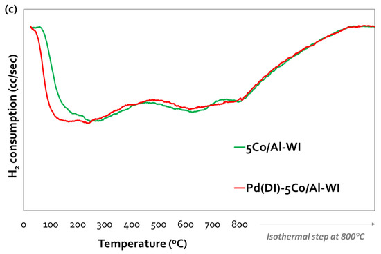 Impressively, the addition of Pd, even at a low loading (0.5 wt.%), affected the reducibility of the catalysts by shifting the reduction profiles to lower temperatures—initiating the reduction of Pd and/or Co oxides at room temperature—thus indicating a significant increase in the reducibility of the catalysts (Figure 3a,b). The Pd incorporation method used on both Co/Al-WI samples (with Co loadings of 1 and 5 wt.%) was the incipient wetness impregnation method (dry impregnation, DI), and their TPR profiles were similar but shifted to lower temperatures as a result of Pd addition (Figure 3a,c). No extra peak due to PdO was observed, probably due to the well-dispersed PdO particles and the interaction with Co/alumina, which facilitated the reduction of Co3O4 [30,31]. The same reduction profile was observed for Pd(DI)-1Co/Al-SI (Figure 3a). The incorporation of Pd into 5Co/Al-SI (Figure 3b) was studied by applying either incipient wetness impregnation or spray impregnation. Both catalysts presented a peak, with a maximum at 100 °C for Pd(DI)-5Co/Al-SI and at 108 °C for 0.5 Pd(SI)-5Co/Al-SI, shifting to lower temperatures (as compared to 240 °C for bare 5Co/Al-SI, with a shoulder at 120 °C). In this case, the impregnation method of Pd seemed to affect the reductive properties of the catalyst and especially H2 consumption; more H2 was consumed for the reduction of Pd(SI)-5Co/Al-SI than Pd(DI)-5Co/Al-SI. It is well known that noble metals like Pd, due to the H2 spillover effect, facilitate the reduction of the Co3O4 and Co-Al oxides formed from the interaction of cobalt with an alumina carrier [30].