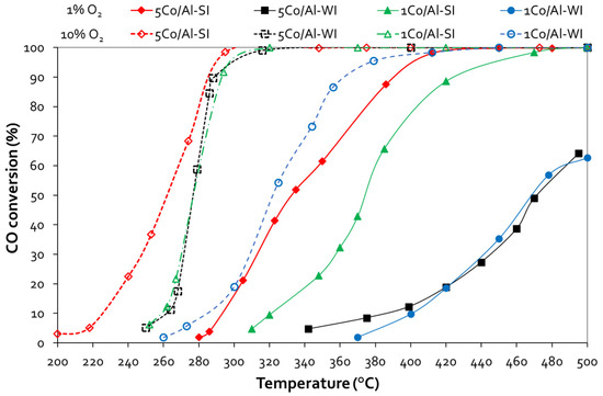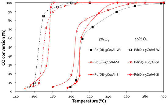 CO conversion vs. temperature plots for Pd-Co/γ-Al2O3 samples prepared with different methods (experimental conditions: 1 vol.% CO—1 or 10 vol.% O2, 40,000 h−1 GHSV).