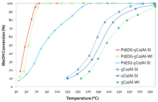 MeOH conversion vs. temperature plots for (Pd)-Co/γ-Al2O3 samples prepared with different methods and various Co loadings (experimental conditions: 0.1 vol.% CH3OH—0.1 vol.% O2, 40,000 h−1 GHSV).