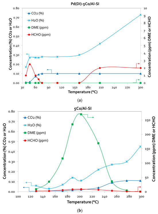 The main products of the methanol oxidation reaction on the Co/Al catalysts were CO2 and H2O in the high-temperature area (250–300 °C), while at lower temperatures (125–250 °C), both products decreased, and DME increased. When Pd was also incorporated into the catalyst surface, besides CO2 and H2O, the main products monitored, traces of HCHO were also detected at low temperatures, without the formation of DME. All of the above are selectively presented for two representative samples, Pd(DI)-5Co/Al-SI and 5Co/Al-SI, in Figure 7a and Figure 7b, respectively.