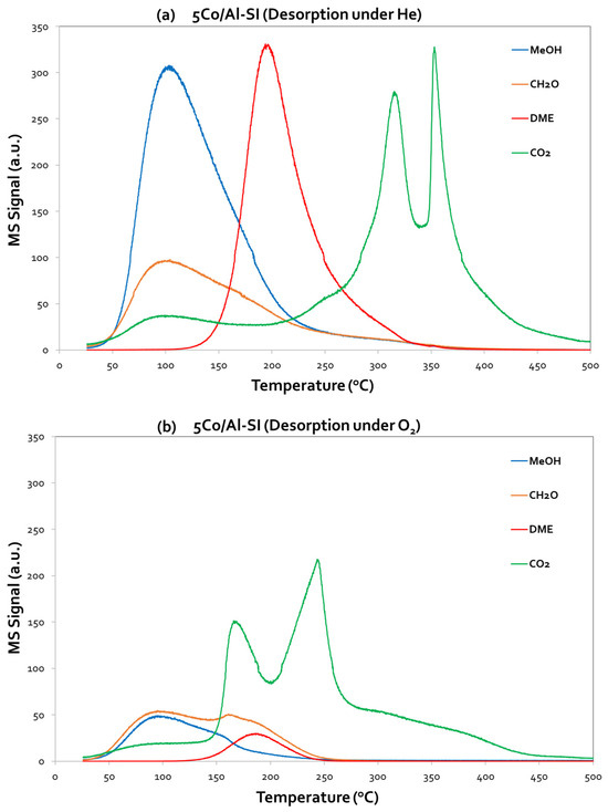 Starting from 5Co/Al-SI (Figure 8), it is obvious that MeOH desorption initiated almost at room temperature and presented a maximum at ~95–100 °C under both desorption steps (He and O2). However, the intensity of the MeOH peaks was different; a higher intensity was observed under He desorption, which suggests that methanol was weakly adsorbed on the catalyst surface and thus desorbed in the gas phase. However, under an O2 atmosphere, the adsorbed methanol reacted with the oxygen, and, thus, less desorbed MeOH was measured. Besides the MeOH signal, CO2, HCHO and DME were also monitored (desorbed), as presented in Figure 8a,b.