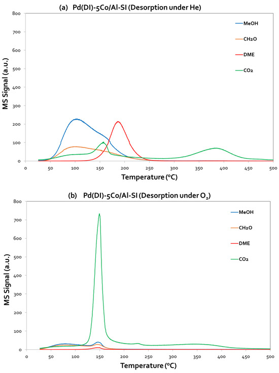 The TPD-MeOH profiles of 5Co/Al-SI and Pd(DI)-5Co/Al-SI are presented in Figure 8a,b and Figure 9a,b, additionally varying the desorption atmosphere, which was under He and/or oxygen flow, respectively. Both figures evidence the desorption (corresponding MS signals) of MeOH, CO2, HCHO and DME.