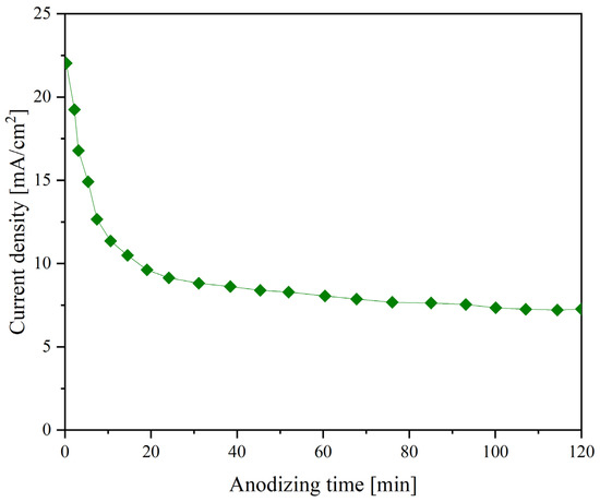 The current plot exhibits a characteristic pattern associated with electrolytes relying on EG. The significant EG viscosity notably affects reagent diffusion into the reaction area [32], leading to a slowdown in the TiO2 and ZrO2 dense layer’s chemical and electrochemical dissolution processes.