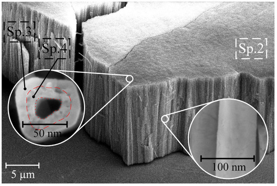 A closer look at the sample’s surface (Figure 4) reveals crystallized HAP (Table 2, Sp. 5), covering parts of the nanostructured surface, which should favor more efficient cell proliferation and bone tissue growth [34]. The cross-section of the samples shows a different morphology than for S2, namely pores filled with HAP (Table 2, Sp. 7). The chemical composition of the pore walls is similar for S1 and S2 and consists of zirconium and titanium oxides (Table 2, Sp. 6).