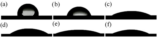 Figure 7. Drops of Hanks’ balanced salt solution on the surface of (a) Ti65Zr; (b) S1; (c) S2; (d) S3; (e) S4; (f) S5.