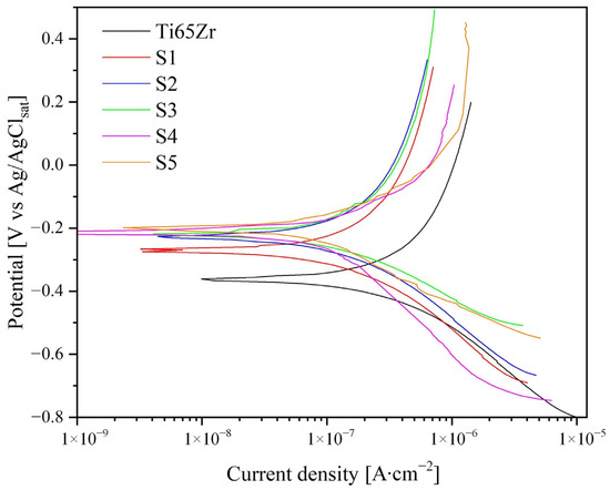Figure 8. Potentiodynamic polarization curves for Ti65Zr and S1–S3.