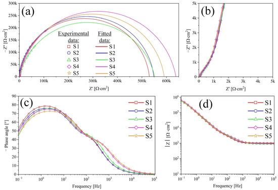 The EIS of S1–S5 is presented in Figure 9, and their equivalent electrical circuit (EEC) is shown in Figure 10.