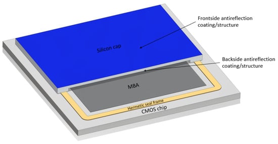 Simplified sketch of a typical MBA-on-CMOS with Si cap for hermetical sealing. The cap is cut to reveal the interior cavity. Dimensions are not to scale. For instance, the width of the MBA sensor area might be approximately 10 mm for a resolution of 640 × 512 pixels and pixel size of 17 µm × 17 µm.