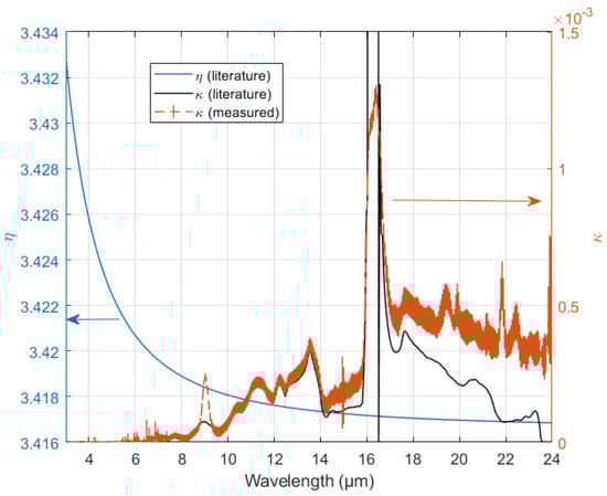 The extinction coefficient of the Si wafers used in this work must be determined, as it depends on the doping and impurity levels, which vary widely between wafer types. By measuring the transmittance through four unprocessed wafers, was determined using Equations (1)–(3). The result for as well as the data used for are shown in Figure 2. For the four wafers measured, a significant variation in absorption was observed, as indicated by the error bars. The average value for was used in all following calculations. The absorption bands around 9 µm and 19 µm in are known to be due to oxygen complexes in Si [17,18], while the remaining bands above 7 µm, including large peak near 16 µm, can be ascribed to lattice absorption [19]. It can be seen that the measured absorption peaks around 9 µm is higher than the referenced result, while the absorption peaks around 16 µm is lower. The former may due to the higher oxygen content in CZ wafers.