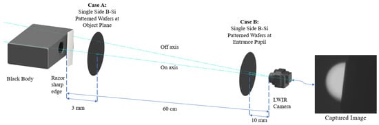 Setup for capturing images using slanted edge method. The wafer is positioned either near the razor edge (Case A) or near the camera lens (Case B). The razor edge is rotated by 6 relative to the vertical axis, as shown in the captured image. On-axis measurements are performed with the camera detector array pointing directly to the black-body source, while off-axis measurements are performed by rotating the camera by 9.